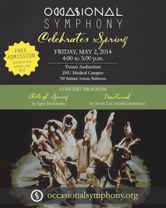 News | May 2, 2014Nocturnal is Lee’s newest and most ambitious orchestral work to date. The Occasional Symphony commissioned the work and premiered it on May 2 on the Johns Hopkins University Medical Campus alongside Stravinsky’s Rite of Spring. The piece is in two movements, and evokes the happenings of night. Serene melodies and sounds of mischief from the first movement gradually become depraved in the second, evolving into a wild and relentless dance whose ruthless pulse seems to extend the boundaries of night beyond the break of dawn.